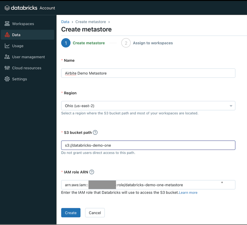 IMPORTANT: The metastore should be in the same region as the workspaces you want to use to access the data. Make sure that this matches the region of the cloud storage bucket you created earlier.