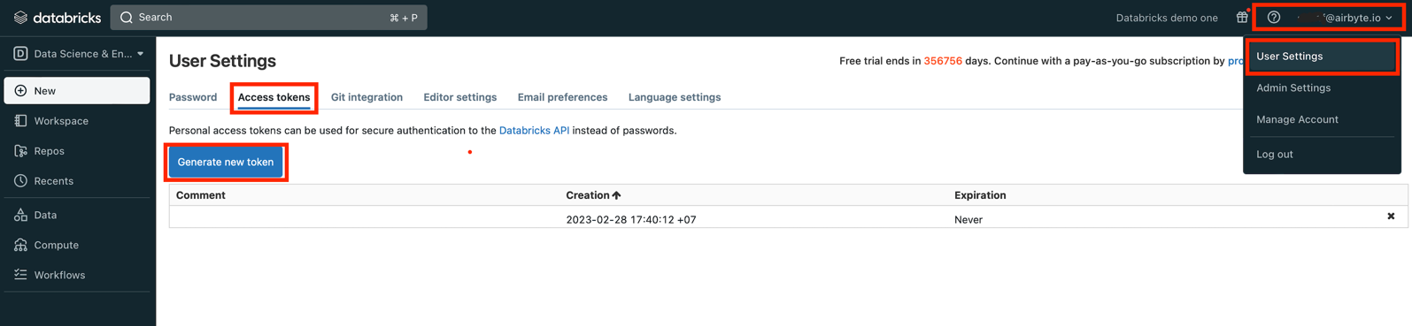 • Open User Settings, go to Access tokens tab and click Generate new token: